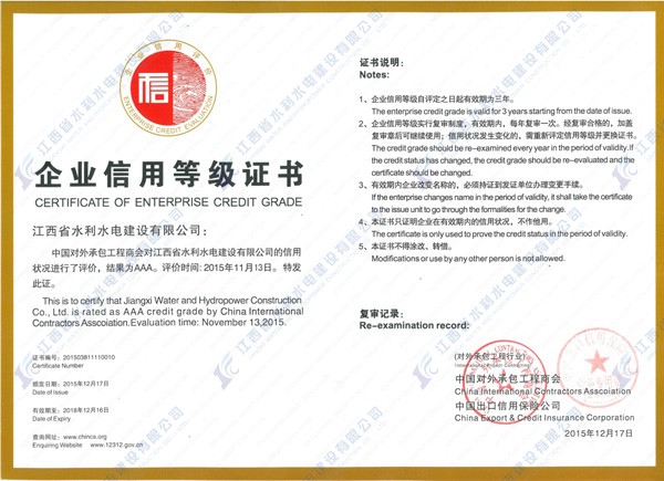 集團(tuán)資訊根據(jù)商務(wù)部、國資委聯(lián)合發(fā)布的《商會協(xié)會行業(yè)信用建設(shè)工作指導(dǎo)意見》和《關(guān)于進(jìn)一步做好行業(yè)信用評價工作的意見》的要求,結(jié)合承包商會關(guān)于推進(jìn)行業(yè)信用體系建設(shè)的工作部署,承包商會于2015年7月啟動2015年度對外承包工程企業(yè)與勞務(wù)合作企業(yè)信用等級評價工作,經(jīng)對外承包工程企業(yè)與勞務(wù)合作企業(yè)信用等級評審委員會第十一次工作會議審議,江西省水利水電建設(shè)有限公司被評定為2015年度對外承包工程企業(yè)信用評價AAA級信用企業(yè)。