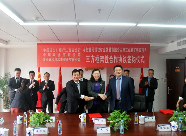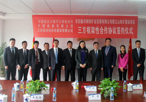 12月29日上午,在江西省商務(wù)廳副廳長(zhǎng)方向軍、外經(jīng)處處長(zhǎng)王健的見(jiàn)證下,公司與中國(guó)進(jìn)出口銀行江西省分行和中鋼設(shè)備有限公司就老撾鑫河鋼鐵礦業(yè)發(fā)展有限公司爬立山鐵礦建設(shè)項(xiàng)目正式簽訂三方框架性合作協(xié)議。中國(guó)進(jìn)出口銀行江西省分行行長(zhǎng)鄭麗、中鋼設(shè)備有限公司總經(jīng)理王建、公司董事長(zhǎng)王元旦、海外公司總經(jīng)理黃鄭民等出席簽約儀式。